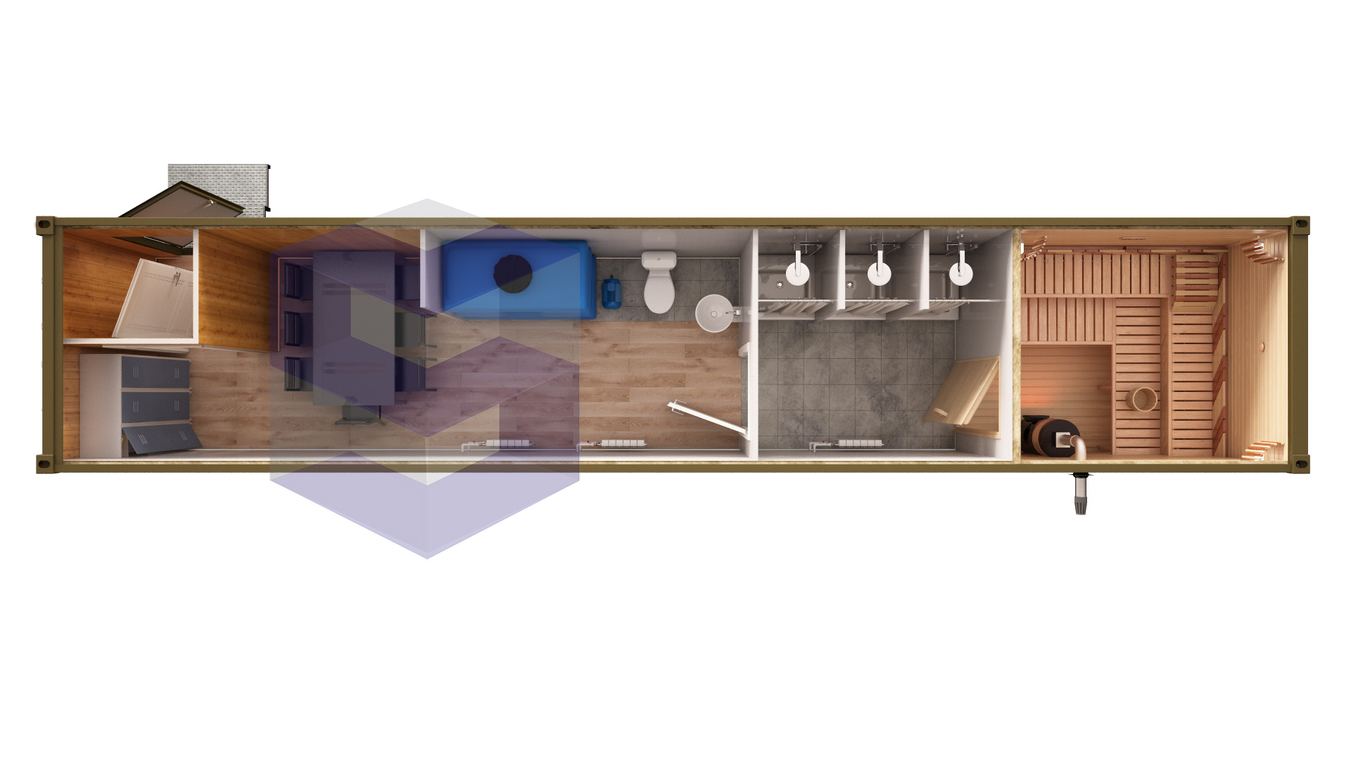 Баня из контейнера 40 футов – один из продуктов премиум-класса, который производится на нашем заводе и реализуется в Ангарске. Мы изготавливаем надежные и долговечные конструкции, которые могут иметь различную конфигурацию и комплектацию в зависимости от требований клиента.